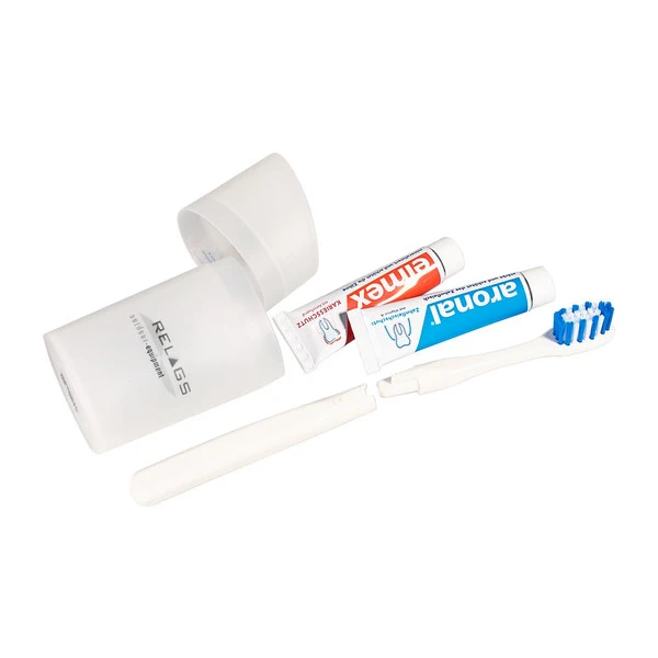 Kleines, formschönes Zahnputz-Set mit hochwertiger Falt-Zahnbürste und 2 x 9,4 ml Zahnpasta.