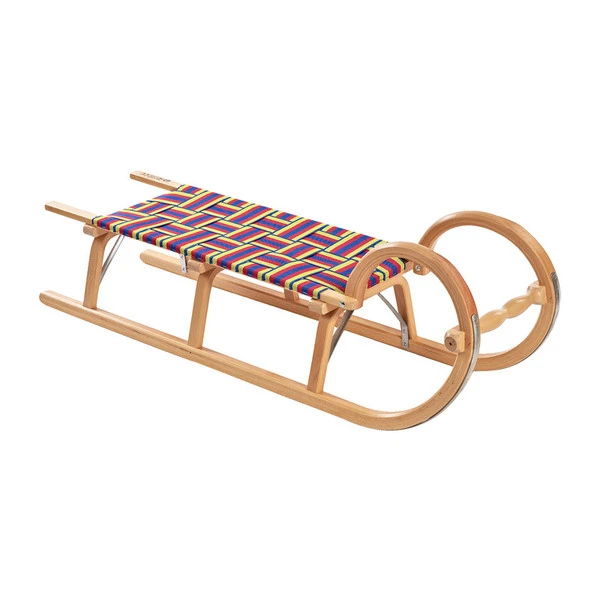 Der formschöne Hörnerrodel ist mit Kufen, Böcken und geschwungenen Hörnern aus verleimtem Buchen-Formholz ausgestattet. Die großzügige Sitzfläche bietet je nach Größe bis zu 2 Personen Platz. Die Kufen sind mit Halbrundeisen aus verzinktem Stahl beschlagen und somit, ebenso wie die Stützeisen und Schrauben, rostfrei. Schutz vor Witterungseinflüssen wird durch eine ökologisch unbedenkliche Tauchlackversiegelung gewährleistet.